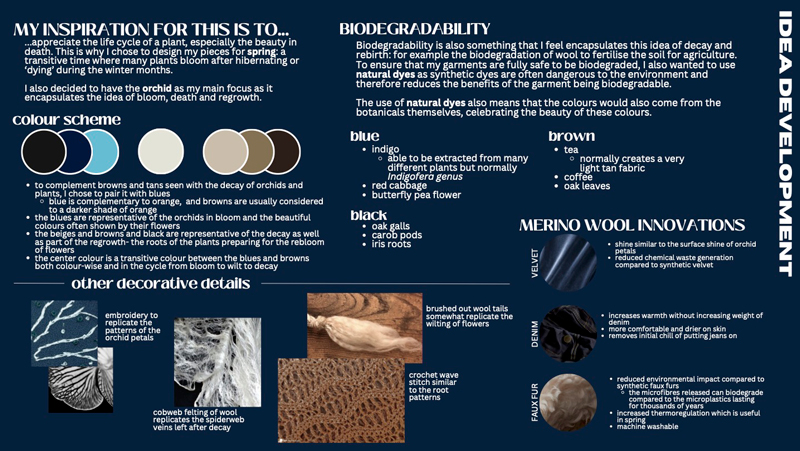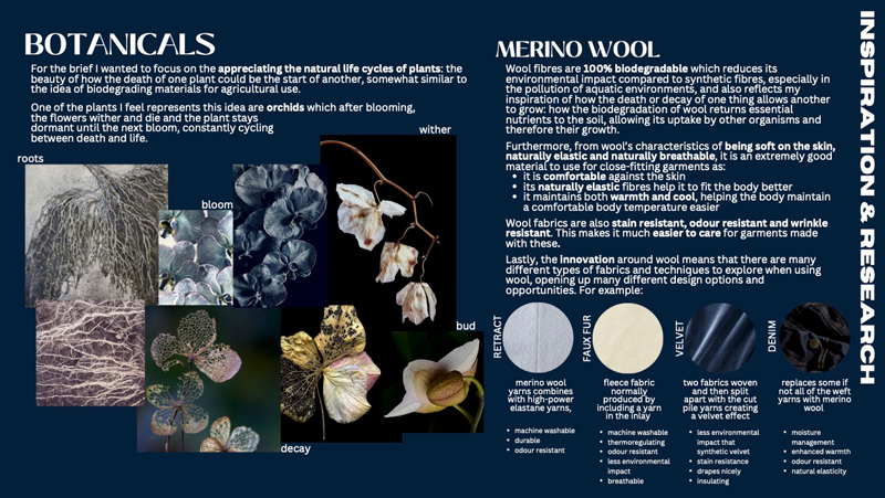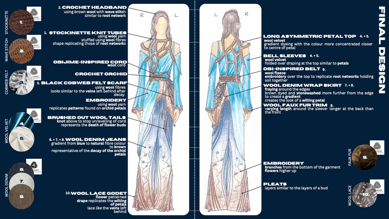 Amy focussed on the natural life cycles of plants: the beauty of how the death of one plant could be the start of another, similar to the biodegradable and renewable attributes of wool. She chose the orchid – and the idea of its bloom, death and regrowth – as the main focus of her design.