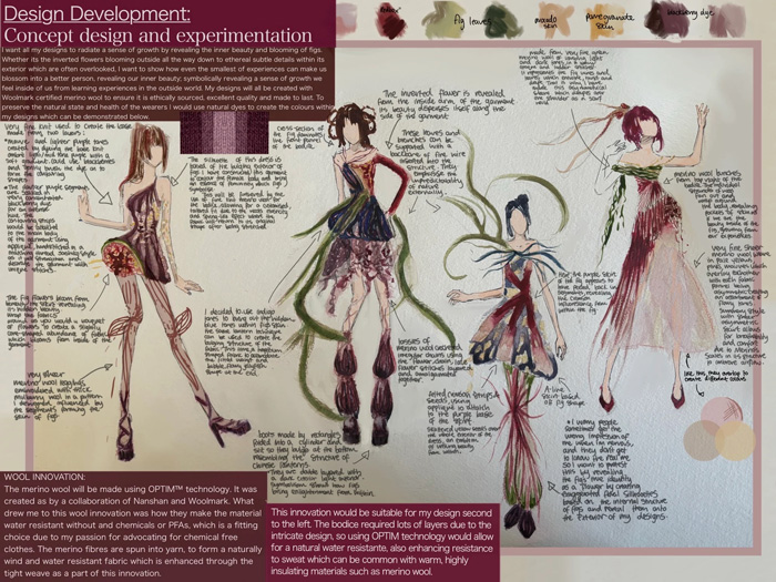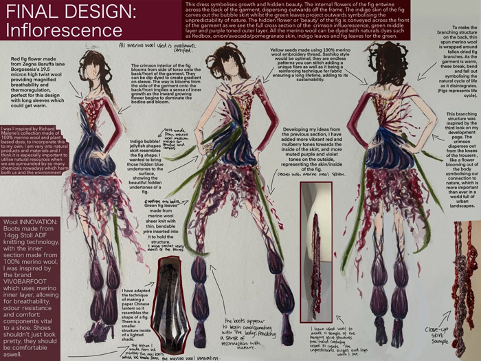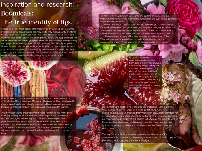 My designs focus on an often-overlooked fact: that figs are in fact flowers, not fruits. Through my designs, I am able to show the hidden beauty of the fig flower by incorporating a range of Merino wool materials and innovations. I intended to show how the fig blooms within my designs so that the inflorescence is recognised and its beauty admired. The use of all-natural Merino wool benefits my botanical designs creating a sense of reconnection with nature, considering many clothes today are made with various chemicals.